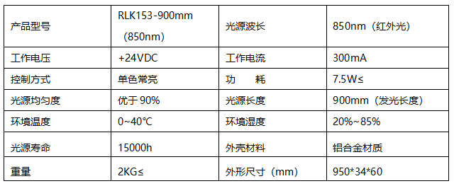 RLK153-900mm(850nm)条形光源是我司根据市场需求专门研发出的一款条形光源,该光源是RLK189Lamp光源的升级款,发光体采用LED灯珠、电路板采用铝基板加工而成,光源顶部装有高透过性的石英玻璃棒用于对外透光,除此之外严格的结构设计及加工工艺保证该条形光源具有特殊散热设计,功耗小寿命长、稳定性高、均匀性好、稳定性高等优点。该条形光源因其高亮度及良好的均匀性,可用于产品尺寸缺陷检测及纠偏系统等领域客户。